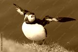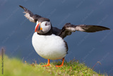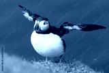 Puffin takes off to catch fish on Shetland Island with strong winds