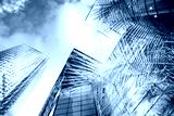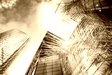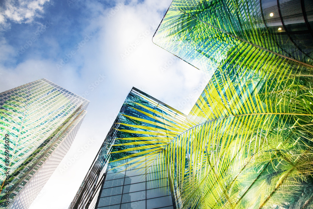 green city - double exposure of lush green forest and modern skyscrapers windows