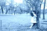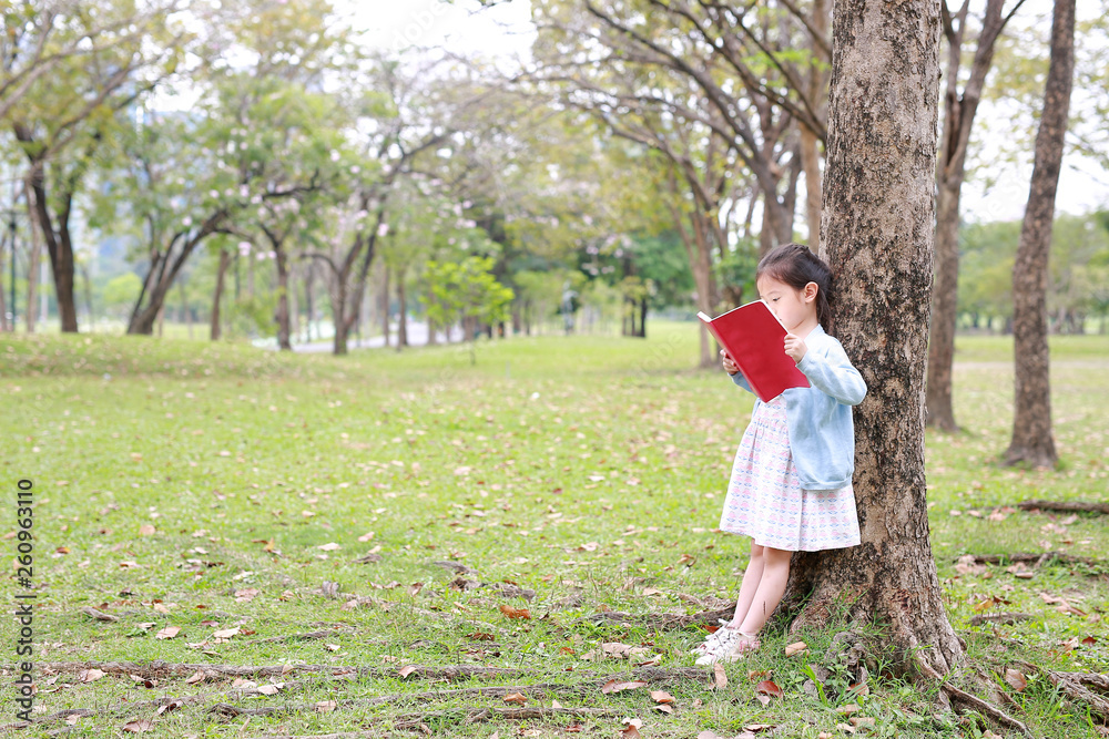 Pretty little child girl reading book in park outdoor standing lean against tree trunk in summer garden.