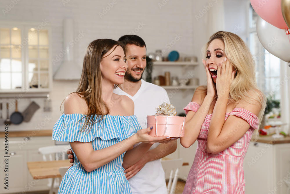 Best friends at the party giving gifts to the surprised birthday girl. Lovely couple cogratulates their girl friend with present and baloons. Birthday party concept