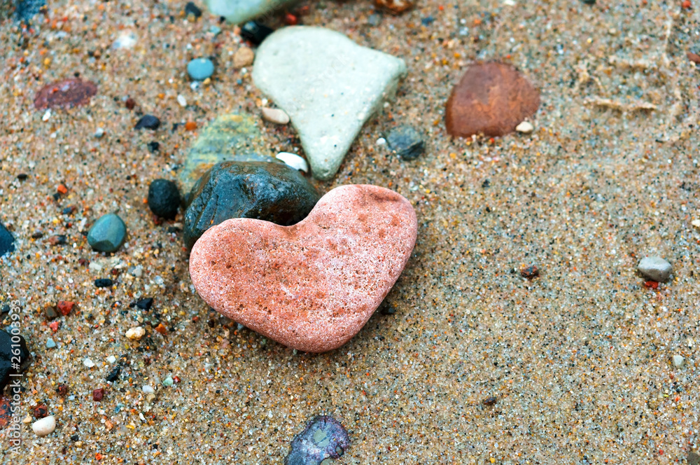 A heart-shaped sea rock on a sandy background. A heart of red stone.