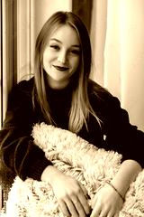 beautiful young girl sitting alone on the windowsill and looking at the camera and smiling.