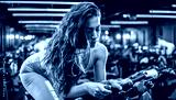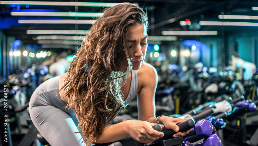 Beautiful young sportswoman riding stationary bicycle during cycling training in gym