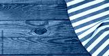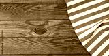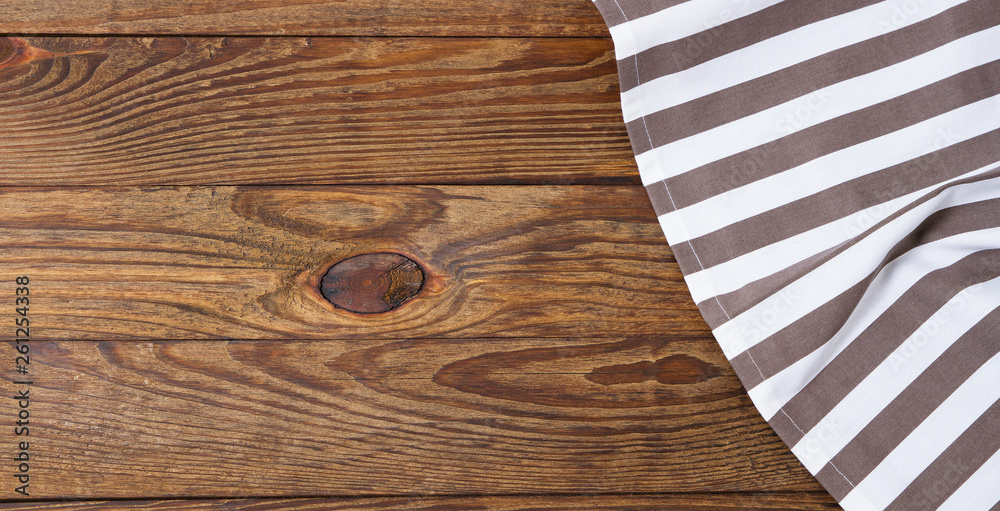Brown old vintage wooden table with framed stripped tablecloth. Thanksgiving day and Cristmas table concept. Top view and copy space. Selective focus. Mock up. Banner