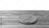 Round pizza food cutting board on brown wooden table isolated on white background. Wood tray plate and table top view. Empty copy space. Selective focus. Banner