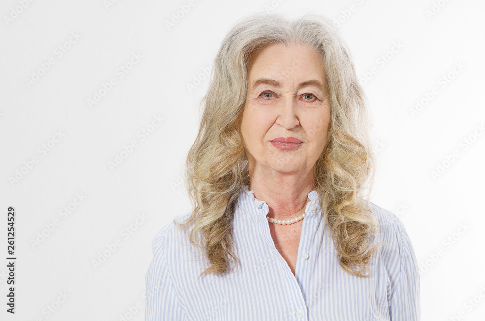 Close up of senior woman face isolated on white background. Happy old lady with wrinkled skin. Health care and wrinkles concept. Mature female. Copy space