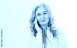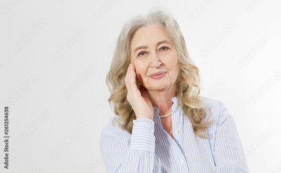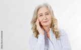 Closeup of smiling senior woman wrinkle face and gray hair. Old mature lady touching her wrinkled skin isolated on white background. Copy space