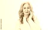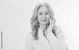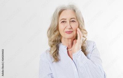Closeup of smiling senior woman wrinkle face and gray hair. Old mature lady touching her wrinkled skin isolated on white background. Copy space