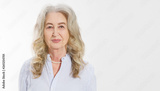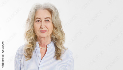 Close up of senior woman face isolated on white background. Happy old lady with wrinkled skin. Health care and wrinkles concept. Mature female. Copy space. Banner