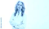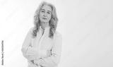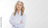 Happy senior woman with crossed arms isolated on white background. Positive elderly seniors life living and european old beauty care. Wrinkled face. Copy space. Banner