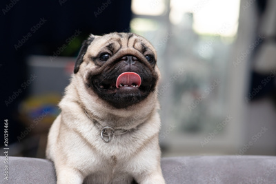 cute dog pug breed have a question and making funny face feeling so happiness and fun,Selective focus