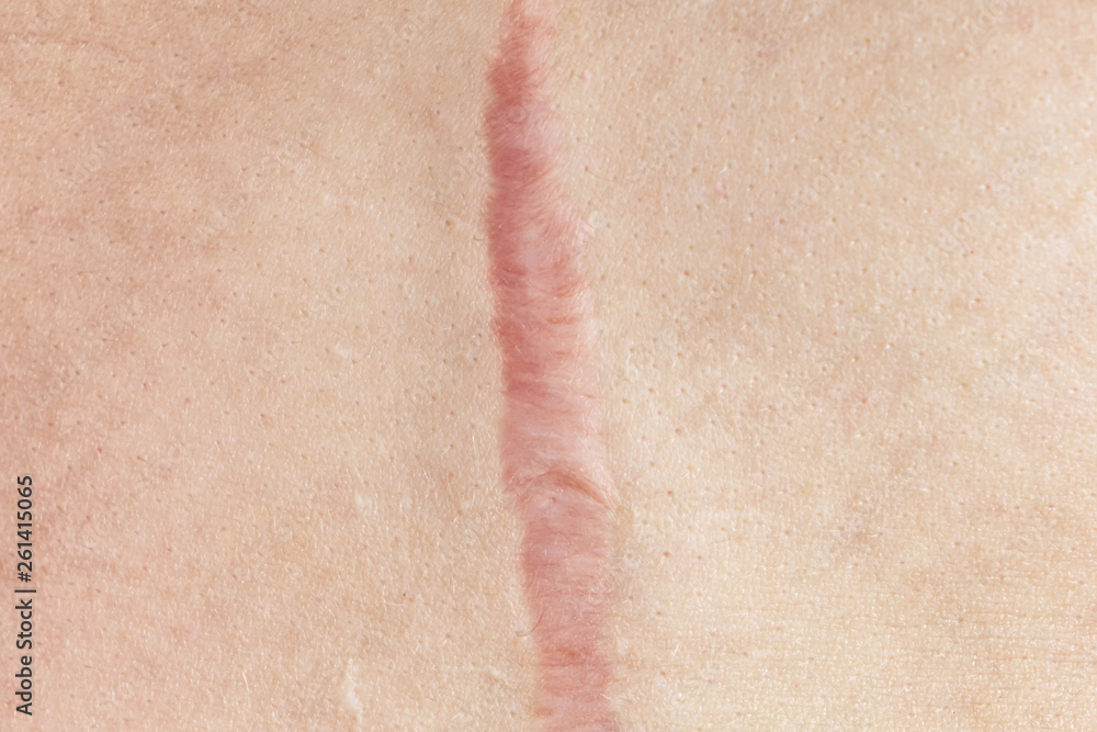 Close up of cyanotic keloid scar caused by surgery and suturing, skin imperfections or defects. Hypertrophic Scar on skin, dermatology and cosmetology concept
