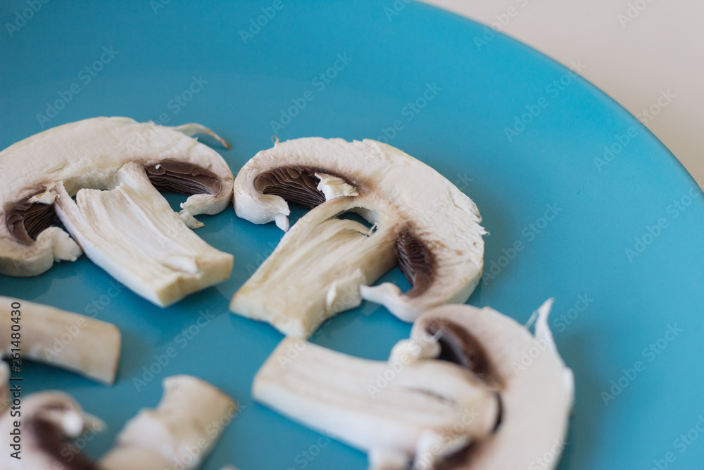 Champignon mushrooms fresh raw vegetarian food on table white background