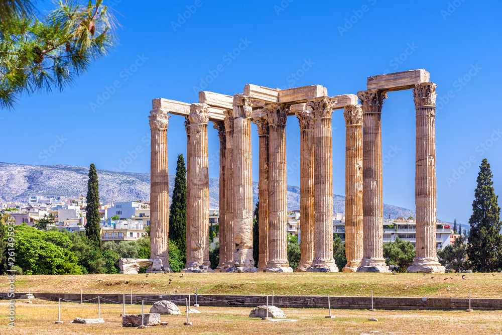 Temple of Olympian Zeus, Athens, Greece. It is one of the top landmarks of Athens. Famous Ancient Greek ruins in the Athens center in summer. Scenic panorama of remains of the antique Athens city.