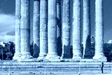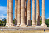 Temple of Olympian Zeus, Athens, Greece. These columns are the tourist attractions of Athens. Woman looks at the ancient ruins in the Athens center. Remains of architecture of the antique Athens city.
