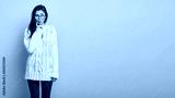 Beautiful girl wonders if she can afford little rest, stands in thoughtful pose, folds llips and touches cheek, focused away, wears long white jumper and red tights, isolated over beige background.