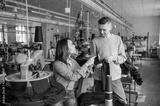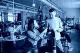 close up photo of a young man and a woman analyzing the work at the linking machine for knitting in textile industry