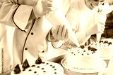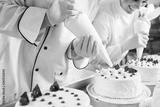 Two pastry chefs decorate a cake from a bag in a pastry shop
