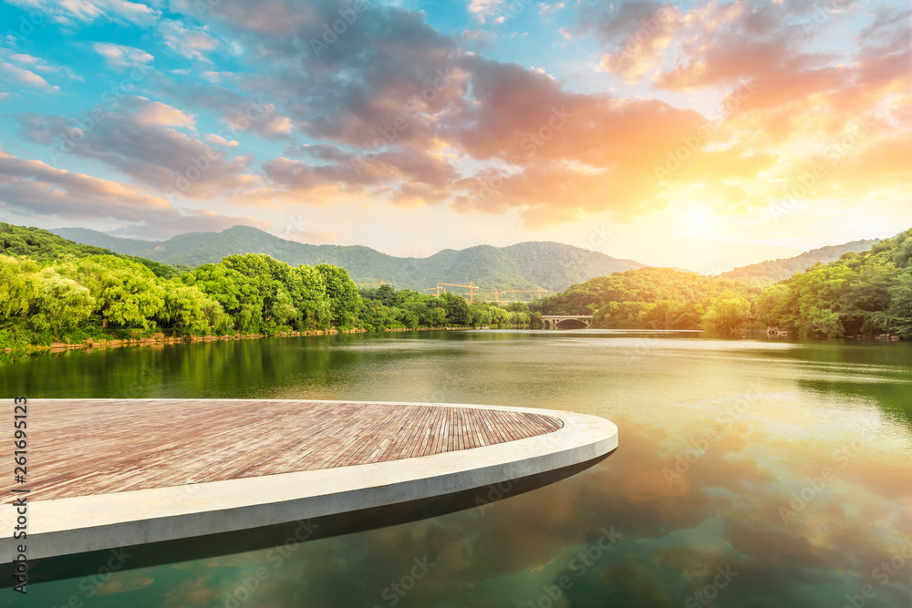 Wooden floor platform and lake with green mountains background in Hangzhou