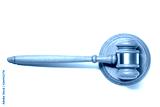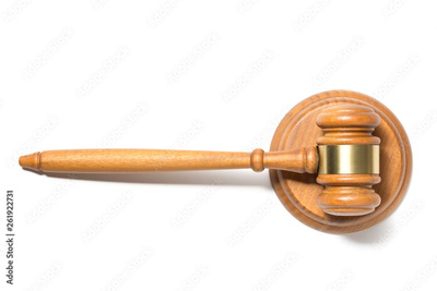 Wooden judge gavel hammer isolated on white background. Top view