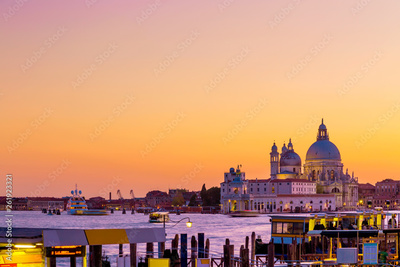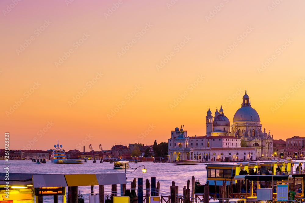 Basilica Santa Maria della Salute in Venice, Italy during beautiful summer day sunset. Famous venetian landmark