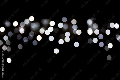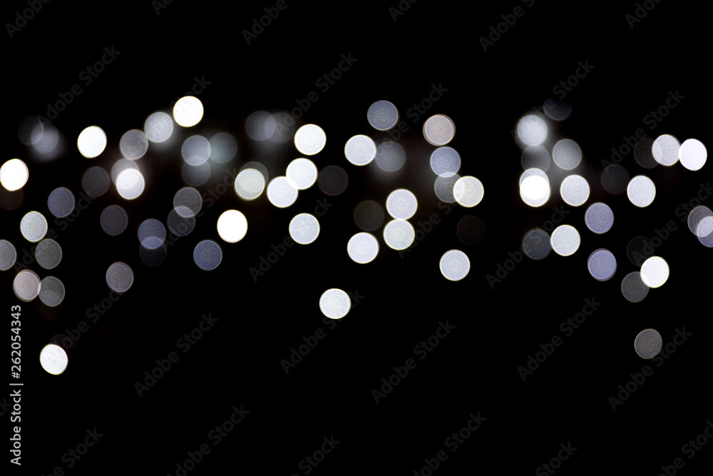 Bokeh white lights on black background, defocused and blurred many round light on background