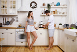 Happy couple woman and man making coffee with machine at their kitchen in new home. Having fun together and cooking breakfast. Happy young family concept