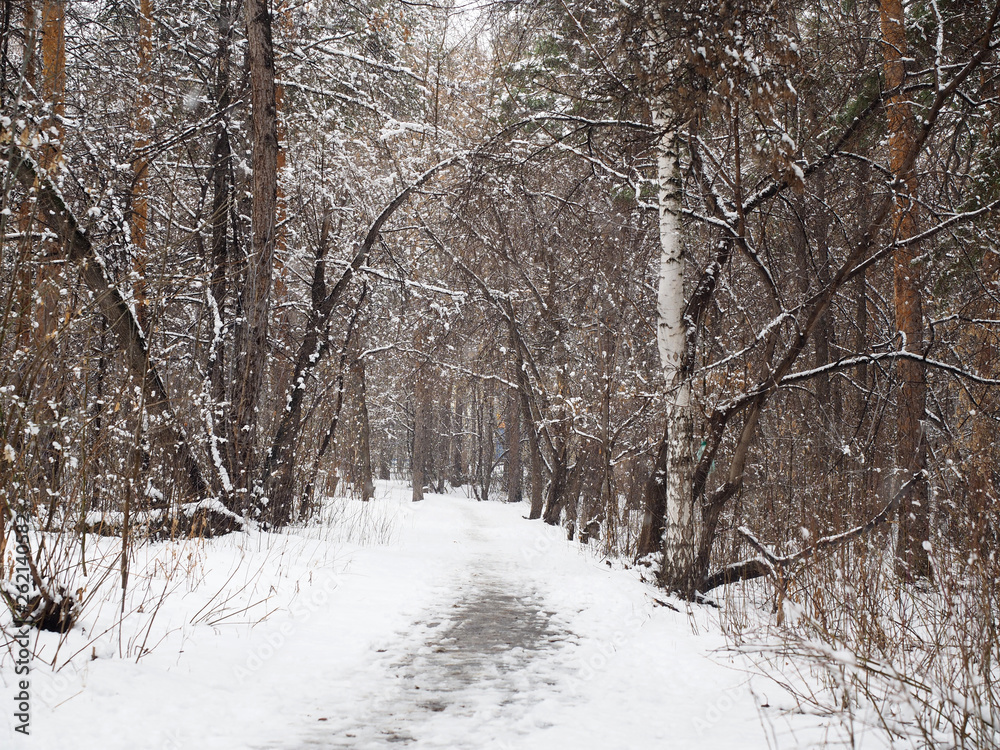 Early spring in city park. Pathway between bare trees, old melting snow and human traces.