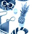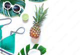 Summer at the beach tropical frame on the white background. Vacation concept flat lay. Top view. Copy space