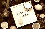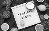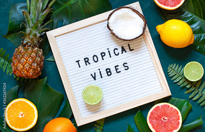 Tropical vibes concept summer card with exotic fruits and text on the felt board. Flat lay. Top view