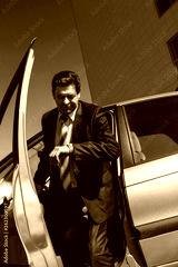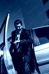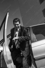 an adult, elderly, handsome man gets out of the car, looking at his watch against the background of a modern building