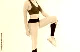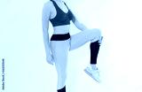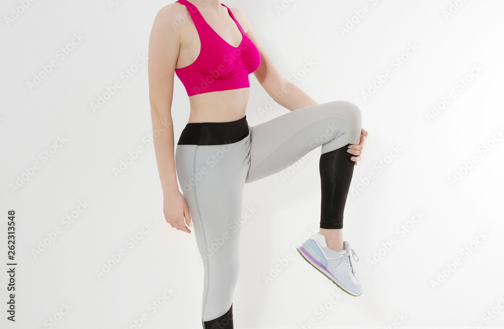 Young sporty girl in sport wear clothes isolated on white background. Happy weight loss woman body concept. Athletic body and adult activity. Copy space. Knee training