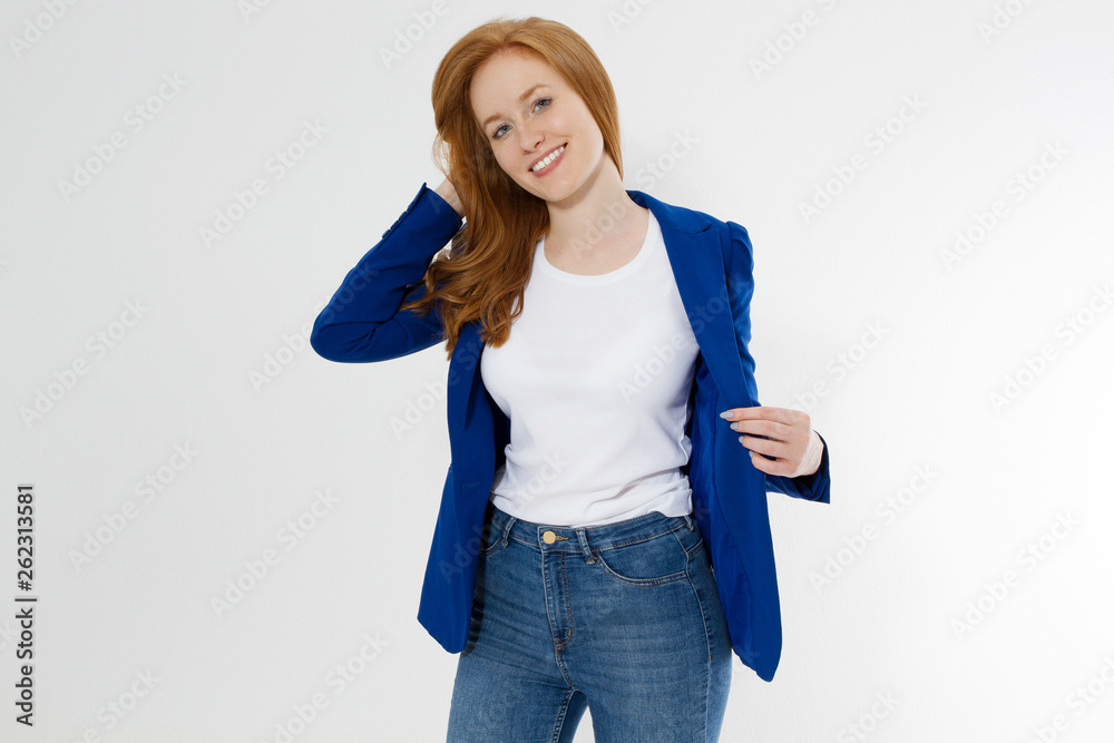 Woman in white t shirt and black leather jacket isolated on white background. Red hair girl in fashion clothes front view. Blank template summer t-shirt. Copy space