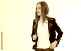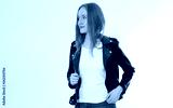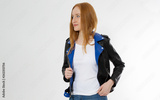 Woman in white t shirt and black leather jacket isolated on white background. Red hair girl in fashion clothes front view. Blank template summer t-shirt. Copy space