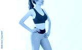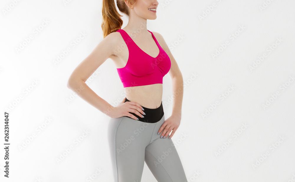 Young sporty girl in sport wear clothes isolated on white background. Happy weight loss woman body concept. Athletic body and adult activity. Copy space and banner