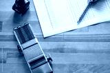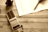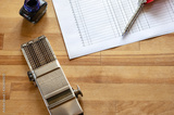 vintage adding machine on ledger purchases journal page with feather quill and ink pot