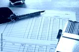 vintage adding machine on ledger accounting page with feather quill and ink pot in background