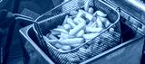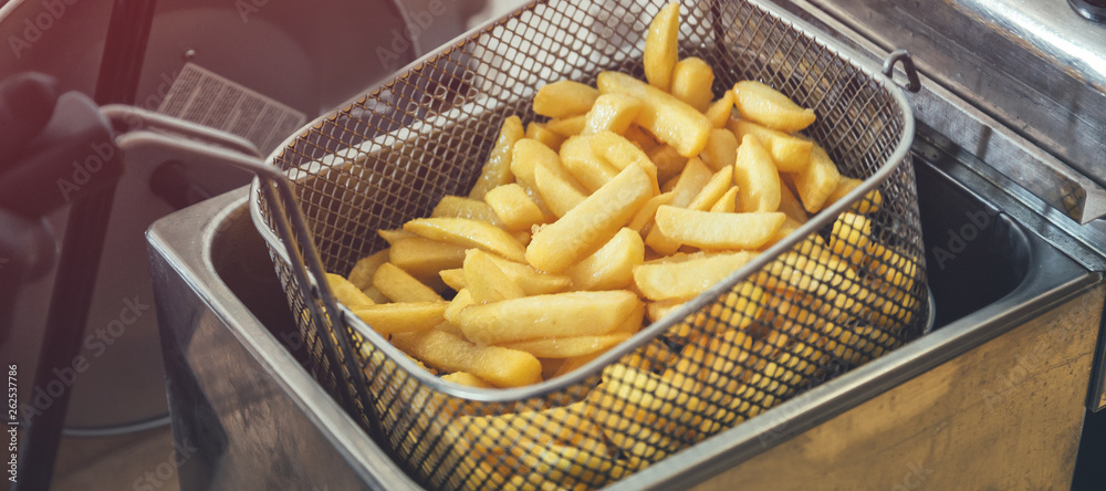 French fries cooking. Grid with strips of potato lowered into boiling oil. The concept of fast food. Belgian frit