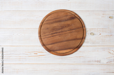 Round pizza cutting board on kitchen white wooden table background. Top view and copy space.