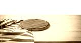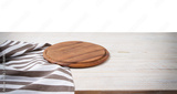 Empty tablecloth on wood table and pizza cutting board isolated on white background. Selective focus. Place for food. Top view. Mockup and template copy space. Banner