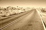 Retro toned picture of a desert road, front focus on asphalt, USA.