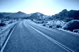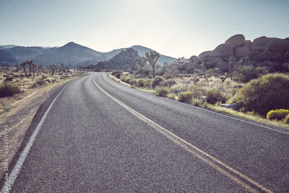 Color toned picture of a desert road at sunset, front focus on asphalt, California, USA.A.