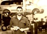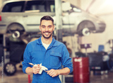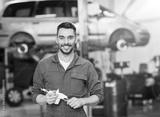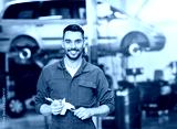 car service, repair, maintenance and people concept - auto mechanic man or smith with wrench at workshop