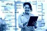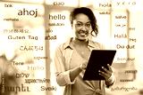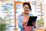 technology, translation and people concept - happy african american woman using tablet computer over greeting words in different foreign languages