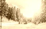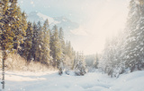 Wonderful wintry landscape . Winter mountain forest. frosty trees and Majestic Mountain on background, under warm sunlight. picturesque nature scenery. creative artistic image. Merry Christmas.