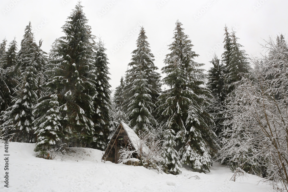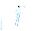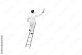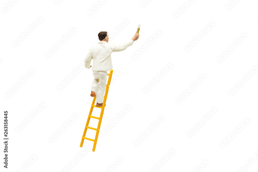 Miniature figurine character as painter standing on wooden ladder and painting wall with paint tools isolated on white background.