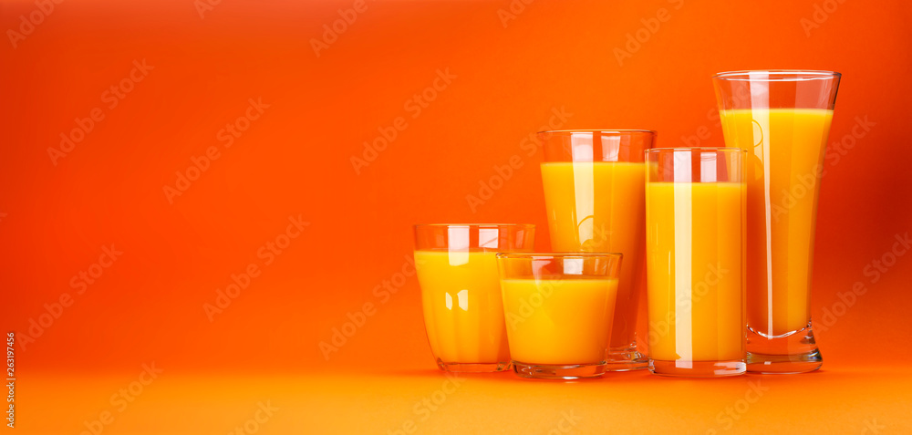 Glasses of orange juice isolated on colour orange background with copy space for text, fresh citrus cocktail