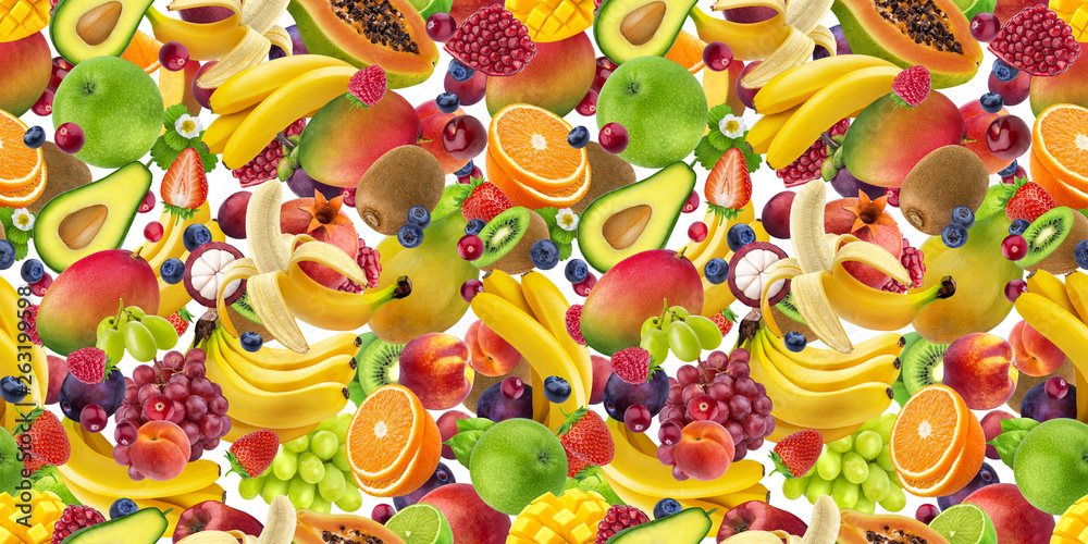 Tropical fruits seamless pattern, falling fruits isolated on white background