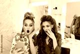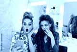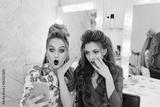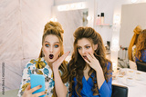 Two fashionable attractive models with stylish makeups, luxury coiffures having fun together in haidresser salon. Friends together, making selfie, expressing true positive emotions, joy, beauty