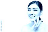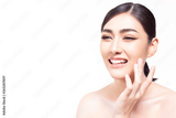 Beautiful young asian woman touching her beautiful face and gets happiness with smiley face. Charming beautiful woman satisfied a product of facial skin care that makes get nice skin face copy space